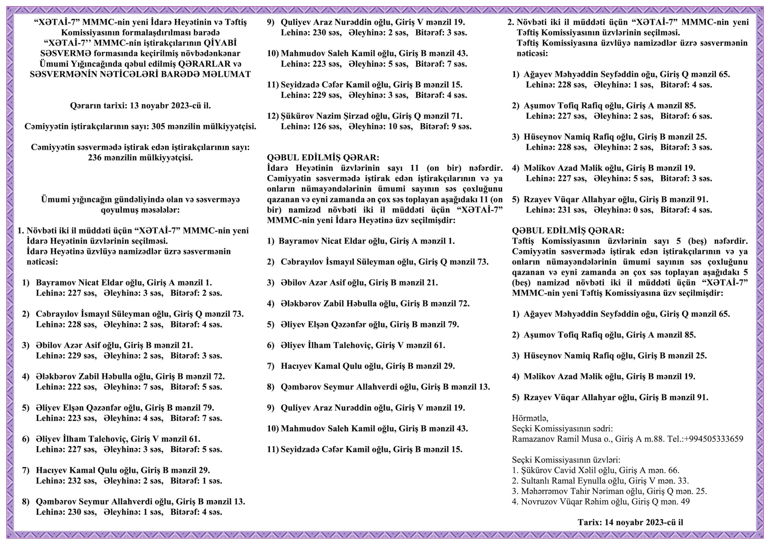 YENİ İDARƏ HEYƏTİNİN VƏ TƏFTİŞ KOMİSSİYASININ FORMALAŞDIRIMASI BARƏDƏ CƏMİYYƏTİN İŞTİRAKÇILARINI ÜMUMİ YIĞINCAĞINDA QƏBUL EDİLMİŞ QƏRARLAR VƏ SƏSVERMƏNİN NƏTİCƏLƏRİ BARƏDƏ MƏLUMAT Posted on 14.11.202316.11.2023 by Admin