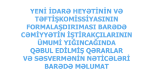 MƏLUMATLAR YENİ İDARƏ HEYƏTİNİN VƏ TƏFTİŞ KOMİSSİYASININ FORMALAŞDIRIMASI BARƏDƏ CƏMİYYƏTİN İŞTİRAKÇILARINI ÜMUMİ YIĞINCAĞINDA QƏBUL EDİLMİŞ QƏRARLAR VƏ SƏSVERMƏNİN NƏTİCƏLƏRİ BARƏDƏ MƏLUMAT