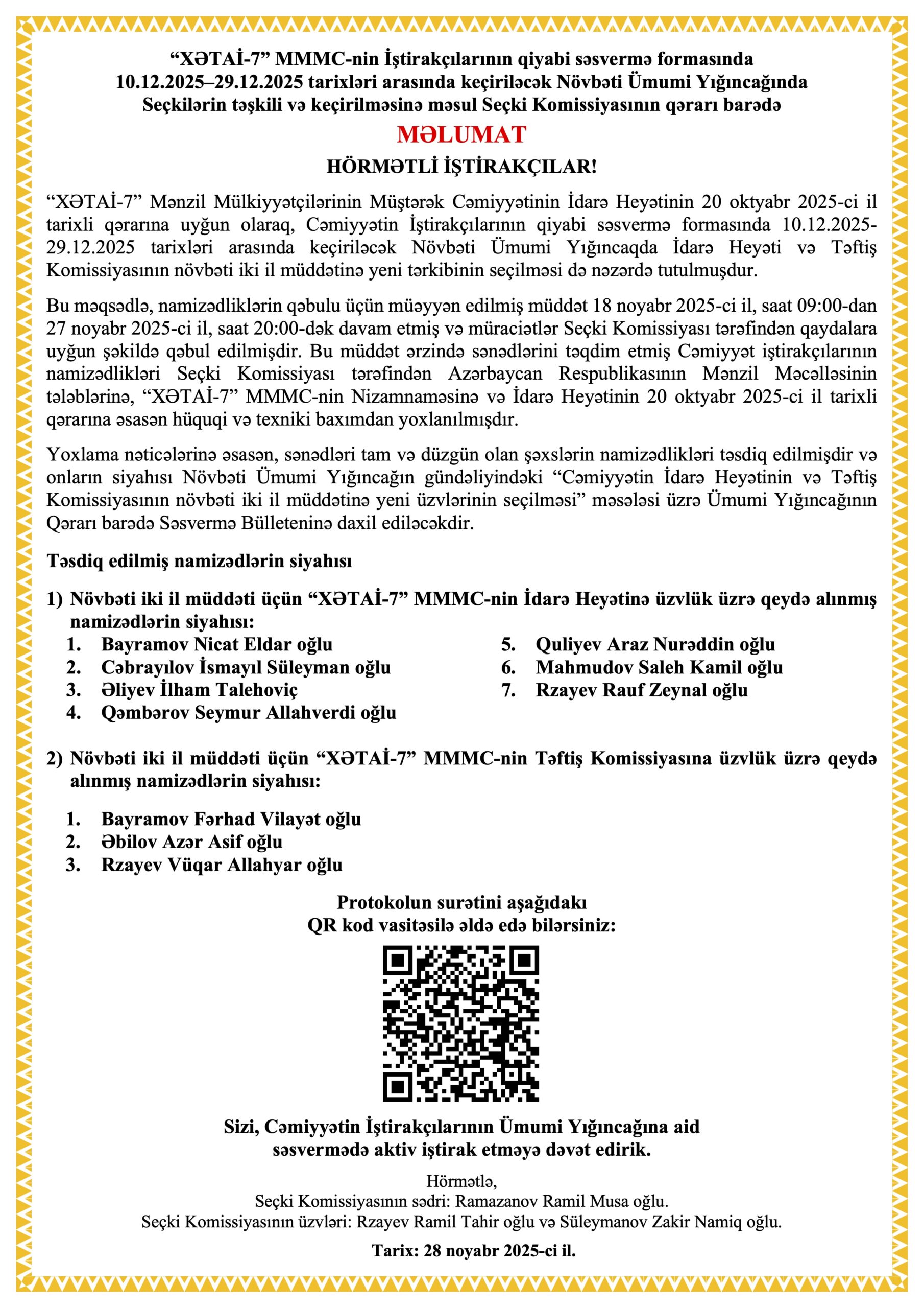CƏMİYYƏTİN YENİ İDARƏ HEYƏTİNƏ VƏ TƏFTİŞ KOMİSSİYASINA ÜZVLÜK ÜÇÜN NAMİZƏDLƏR HAQQINDA MƏLUMAT – 28.11.2025 Posted on 28.11.202528.11.2025 by Admin Seçki Komissiyasının iclasına aid protokolun surətini aşağıdakı link vasitəsilə endirə bilərsiniz: Seçki Komissiyasının 28 noyabr 2025-ci il tarixli iclasına aid SK/01-25 nömrəli protokolun surəti.