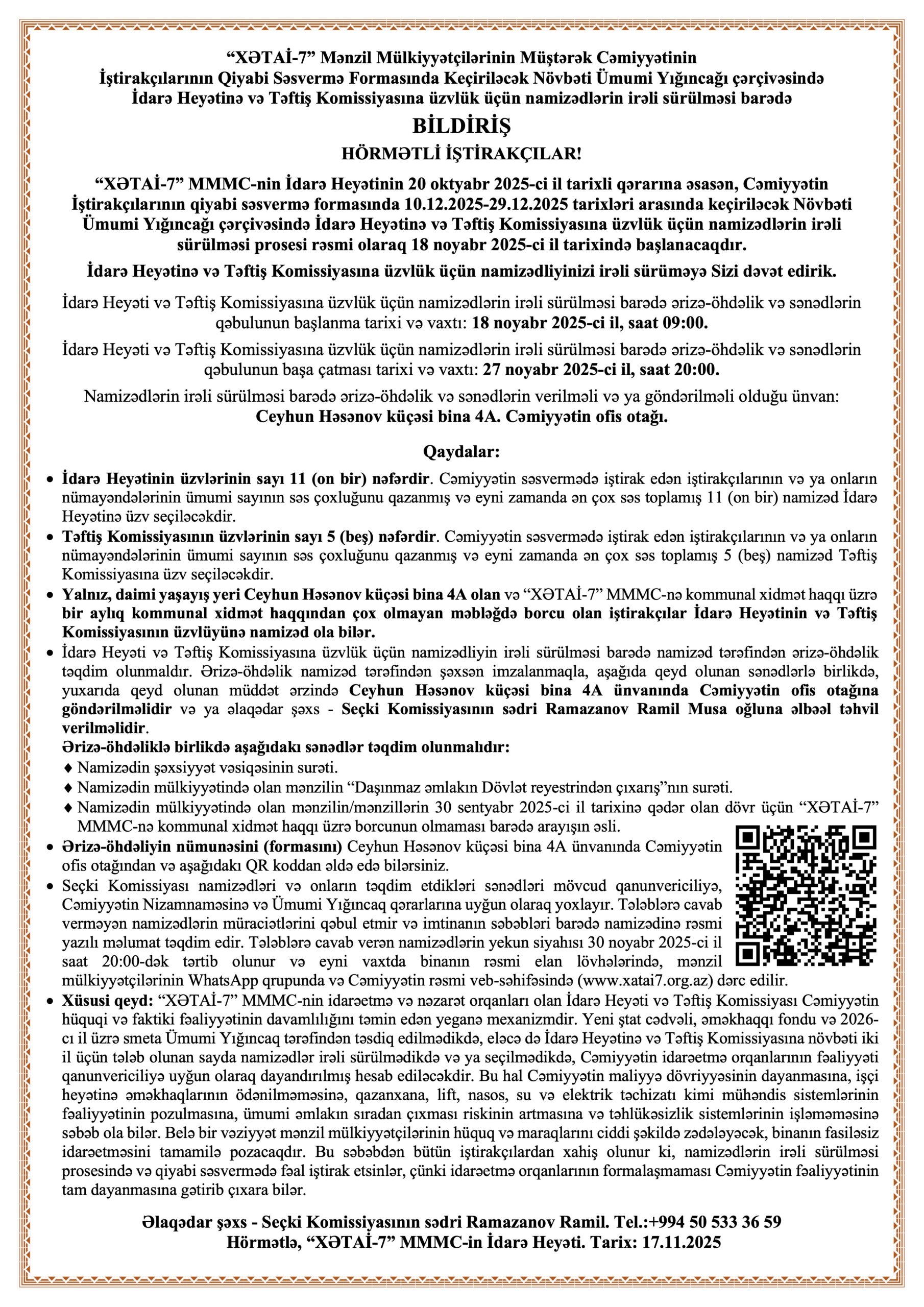 CƏMİYYƏTİN YENİ İDARƏ HEYƏTİNƏ VƏ TƏFTİŞ KOMİSSİYASINA ÜZVLÜK ÜÇÜN NAMİZƏDLİYİN İRƏLİ SÜRÜLMƏSİ BARƏDƏ BİLDİRİŞ – 17.11.2025 Posted on 17.11.202517.11.2025 by Admin Ərizə-öhdəliyin nümunəsini (formasını) aşağıdakı link vasitəsilə endirə bilərsiniz: Ərizə-öhdəliyin nümunəsi (forması)