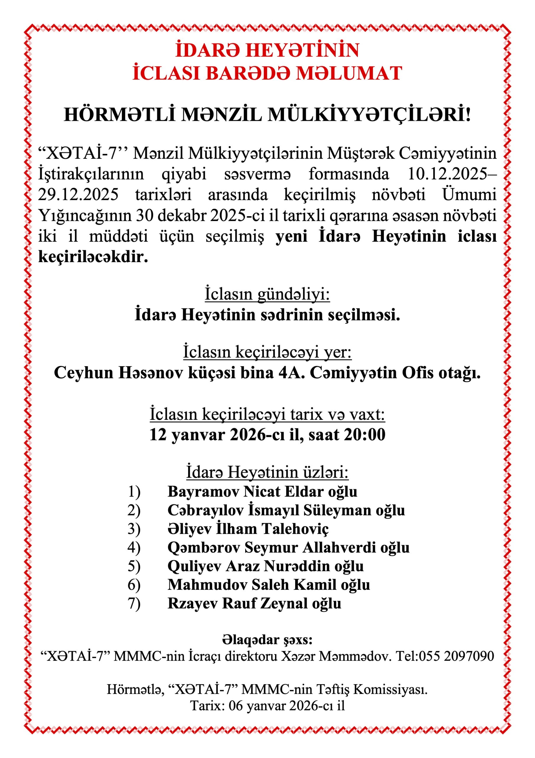 İDARƏ HEYƏTİNİN İCLASI BARƏDƏ MƏLUMAT – 06.01.2026