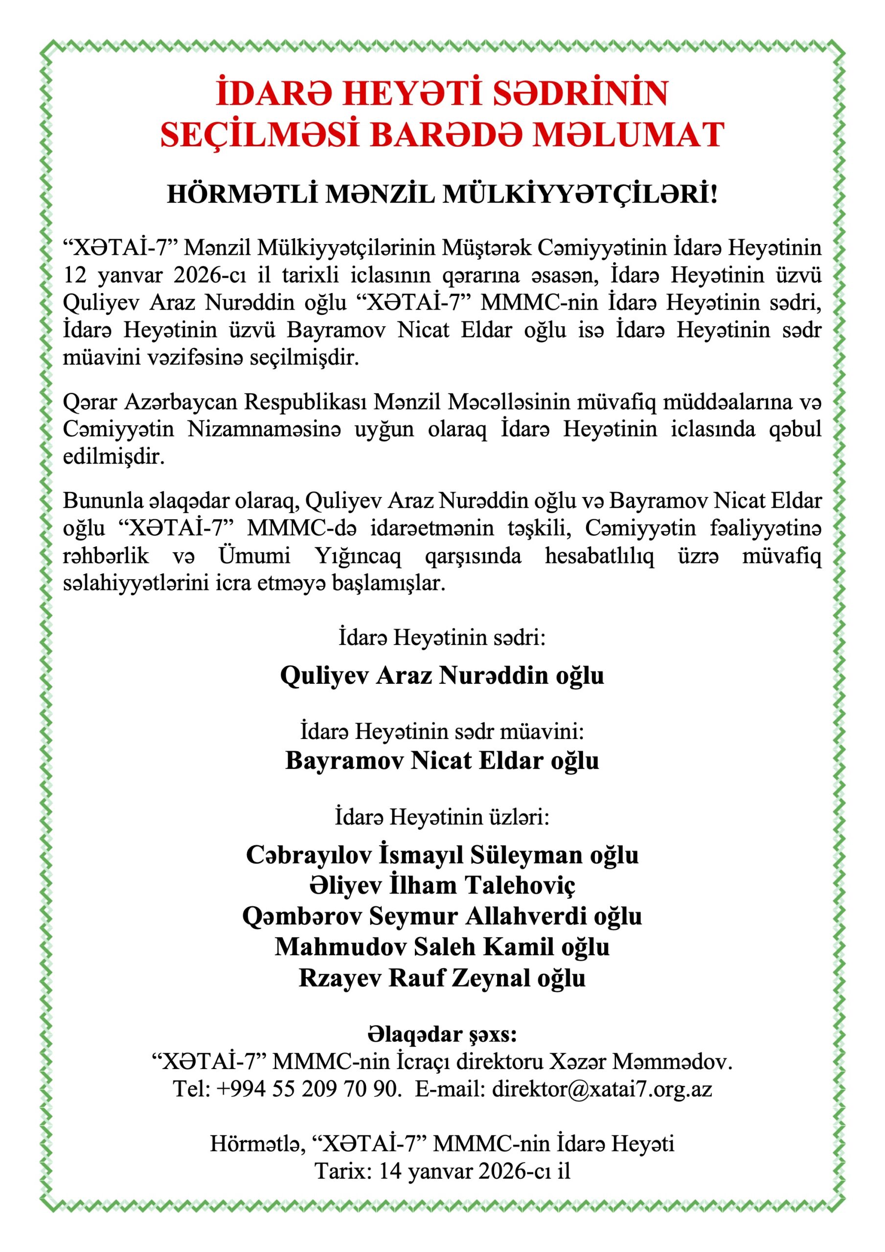 İDARƏ HEYƏTİ SƏDRİNİN SEÇİLMƏSİ BARƏDƏ MƏLUMAT – 14.01.2026