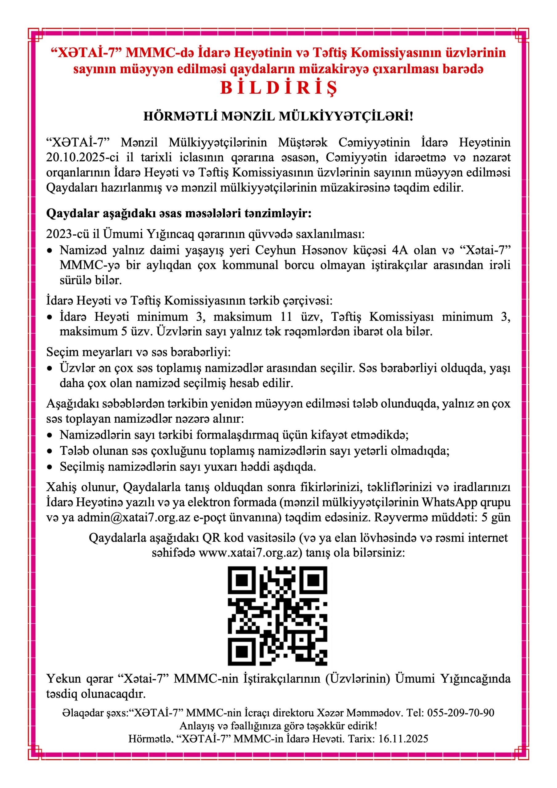 İdarə Heyətinin və Təftiş Komissiyasının üzvlərinin sayının müəyyən edilməsi QAYDALARI Posted on 16.11.202516.11.2025 by Admin Qaydaları aşağıdakı link vasitəsilə endirə bilərsiniz: “XƏTAİ-7” MMMC-də İdarə Heyətinin və Təftiş Komissiyasının üzvlərinin sayının müəyyən edilməsi QAYDALARI