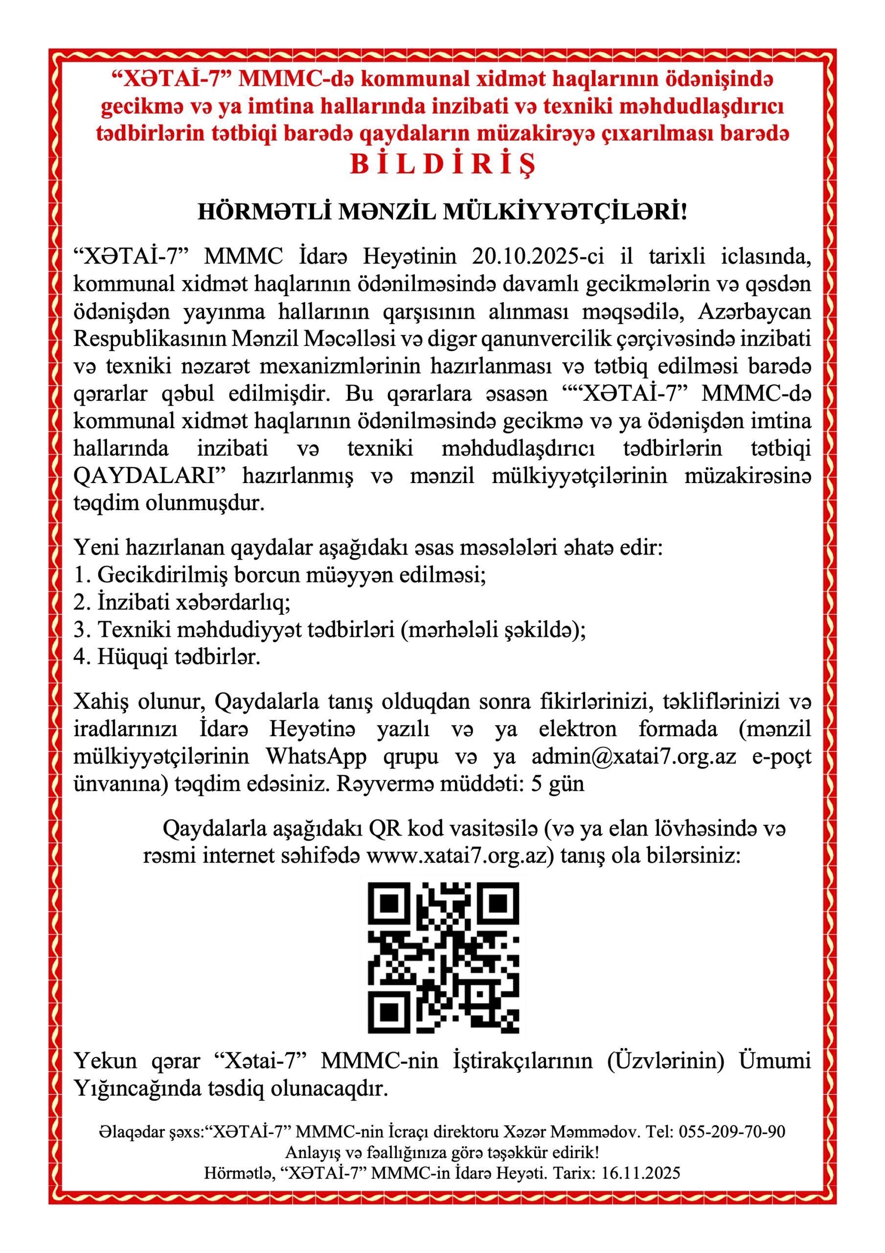 Kommunal xidmət haqlarının ödənilməsində gecikmə və ya ödənişdən imtina hallarında inzibati və texniki məhdudlaşdırıcı tədbirlərin tətbiqi QAYDALARI Posted on 16.11.202516.11.2025 by Admin Qaydaları aşağıdakı link vasitəsilə endirə bilərsiniz: “XƏTAİ-7” MMMC-də kommunal xidmət haqlarının ödənilməsində gecikmə və ya ödənişdən imtina hallarında inzibati və texniki məhdudlaşdırıcı tədbirlərin tətbiqi QAYDALARI