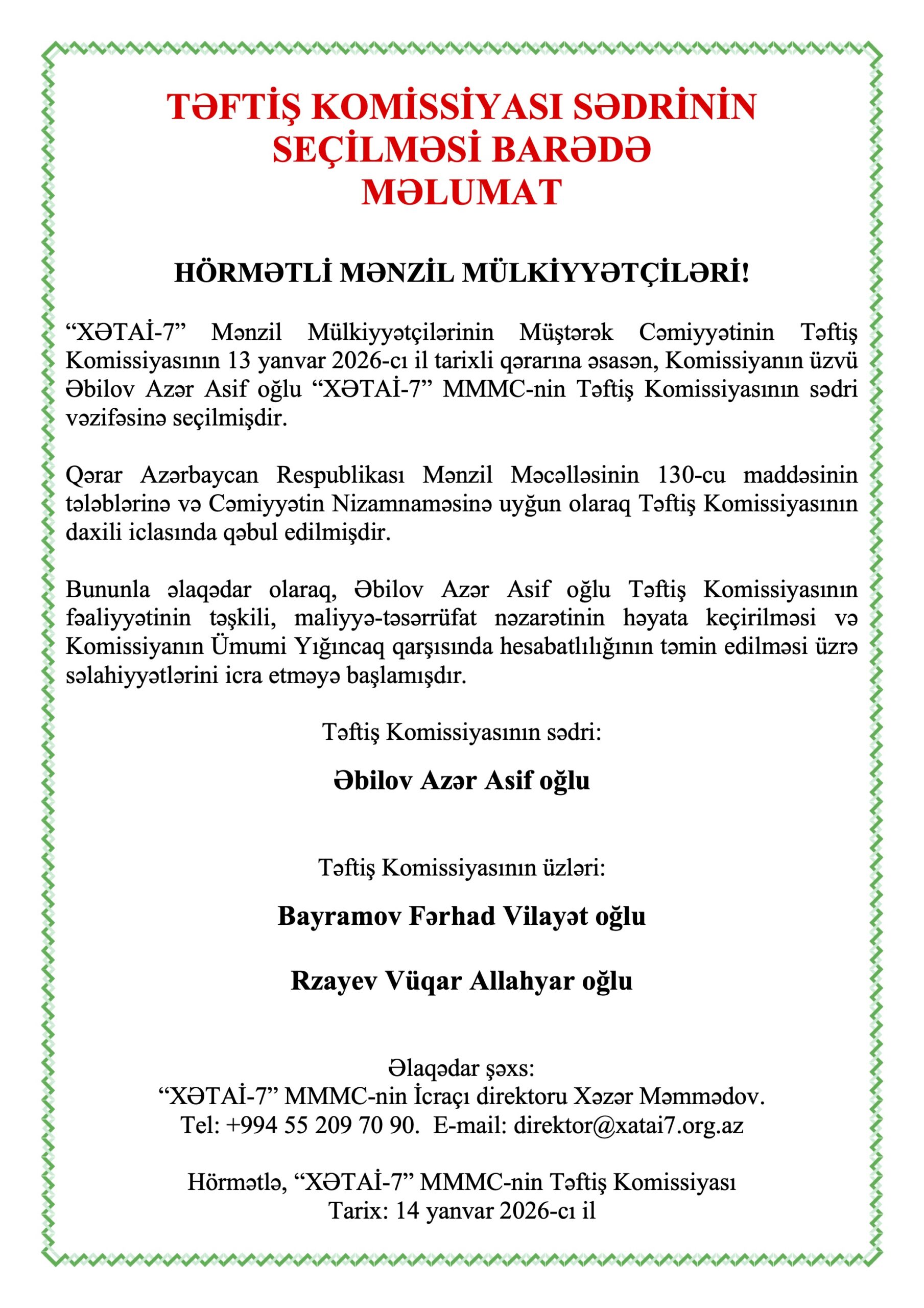 TƏFTİŞ KOMİSSİYASI SƏDRİNİN SEÇİLMƏSİ BARƏDƏ MƏLUMAT – 14.01.2026 Posted on 14.01.202614.01.2026 by Admin