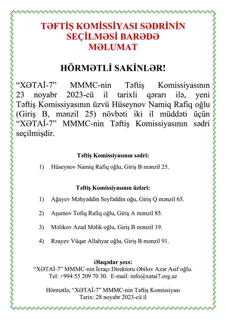 TƏFTİŞ KOMİSSİYASI SƏDRİNİN SEÇİLMƏSİ BARƏDƏ MƏLUMAT