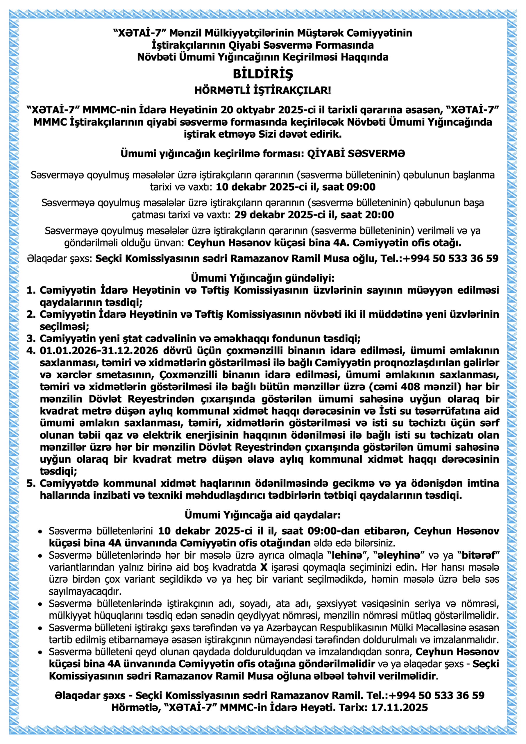 “XƏTAİ-7” MMMC İŞTİRAKÇILARININ NÖVBƏTİ ÜMUMİ YIĞINCAĞININ KEÇİRİLMƏSİ HAQQINDA BİLDİRİŞ – 17.11.2025 Posted on 17.11.202517.11.2025 by Admin