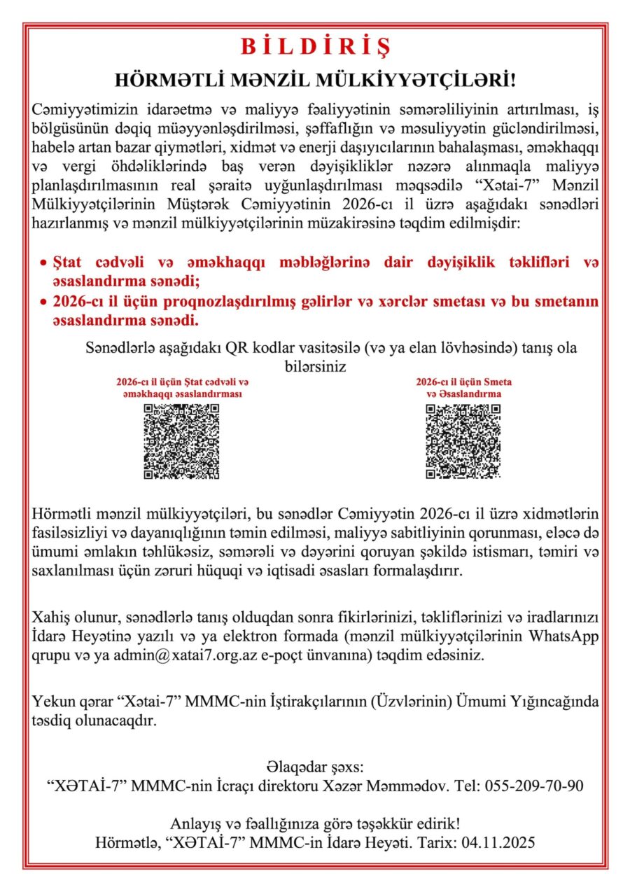 YENİ ŞTAT CƏDVƏLİ VƏ 2026-CI İL ÜÇÜN GƏLİRLƏR VƏ XƏRCLƏR SMETASI – 04.11.2025 Posted on 04.11.202515.11.2025 by Admin Sənədləri aşağıdakı linklər vasitəsilə endirə bilərsiniz: Ştat cədvəli və əməkhaqqı məbləğlərinə dair dəyişiklik təklifləri və əsaslandırma sənədi. 2026-cı il üçün proqnozlaşdırılmış gəlirlər və xərclər smetası və bu smetanın əsaslandırma sənədi.